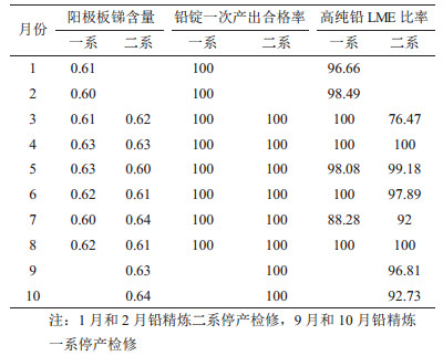 从表 8可以看出,使用粗锑能确保阳极板含锑在工艺要求的范围内(0.6%~1.2%),与使用外购精锑对稳定铅锭质量所起的效果相当。