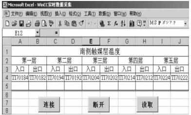 3 实时数据采集的VBA编程新建一个Excel空表,按格式要求设计好报表sheet1,为了说明方便,仅以图 3所示的10个数据(第4行,它们对应于WinCC中的标签变量)的采集为例,它们对应于某冶炼厂硫酸转化系统中五层触媒的入口和出口温度。