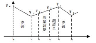 to时刻打开电磁阀进行浇铸;t1时刻浇铸重量达到控制重量关电磁阀;t2时刻调整铅泵频率;t3至to时间内测量注入储铅槽中的铅液流量。
