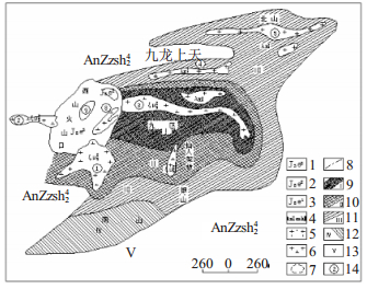 | 1—上侏罗统上部火山熔岩、火山碎屑岩;2—上侏罗统中部集块角砾岩;3—上侏罗统下部千枚质砾岩夹砂岩;4—前震旦系双桥山群千枚岩;5—石英斑岩;6—英安斑岩;7—矿带界线;8—无矿边界线;9—石英绢云母化-铜硫金矿化带;10—石英绢云母化绿泥石化-铜铅锌矿化重叠带;11—绢云母化绿泥石化-铅锌银矿化带;12—绿泥石碳酸盐矿物组合、方铅矿碳酸盐化-铅锌矿化带;13—无矿带;14—岩体编号 图 1 银山铅锌矿床矿化分带示意图 |