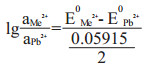 粗铅阳极中含有各种杂质, 它们不仅以单体金属存在, 还会以固溶体、金属间化合物等形态存在, 这样会使阳极反应复杂化。如果杂质以单体存在, 并以同等速度与铅一道放电, 则存在如下的平衡关系(25℃):