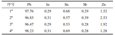 1 试验原料及流程 1.1 试验原料试验原料为锌精馏系统B#塔产出的底铅, 其化学成分如表 1所示。除主体金属Pb外, 还含有一定量的In、Sn、Sb和Zn。
