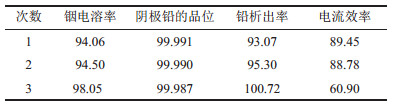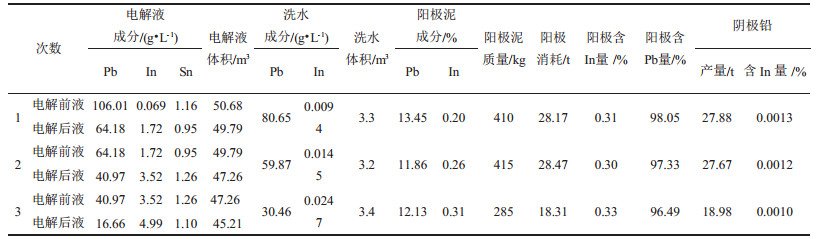 (2) 除第三周期因电解液铅离子浓度较低, 析出铅结晶粗糙, 短路现象较多, 电流效率较低外, 其余技术经济指标均较好, 铟电溶率大于94%, 铅析出率93%, 阴极铅主品位大于99.98%。