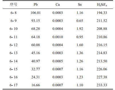 从表 4可以看出, 阴极铅的品位随电解周期增加略有下降, 但从整个试验过程来看, 影响阴极铅质量的主要杂质元素为锑、锡, 由于后续有除锑、锡工艺, 因此阴极铅质量的波动并不影响铅锭质量, 实践证明, 试验产出的阴极铅经碱性精炼工序后浇铸出来的铅锭牌号仍为高纯铅LME。