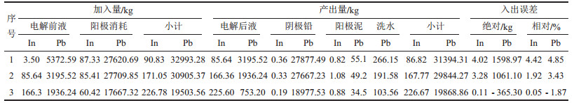 对试验过程中的三个周期的电解进行了铟、铅的金属平衡, 结果如表 6所示。从表中可以看出, 两种金属都平衡得很好, 铟在第一周期相对误差最大, 为4.02%, 铅在第一周期相对误差最大, 为4.42%, 但三个周期的金属平衡率都大于95%, 与中南大学小试试验报告一致。从表 3可以看出, 洗液中的铟微量, 可忽略不计。