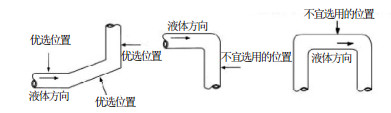 3 安装要求该流量计应安装在直管段内,其长度视具体现场取不同值,要求直管段部分表面平滑、较新,圆度较好。首选液体向上(或斜向上)流动的竖直管路,尽量避开液体向下(或斜向下)流动的管路,防止液体不满管,详见图 1。测量点不能选在管路走向的最高点,防止管路内因有气泡聚集而造成测量不正常。当安装材质为可焊材料时,则焊接上一个由厂方提供的金属底座,当材质为不可焊时,可使用厂方提供的专用卡具,然后再进行钻孔安装传感器。