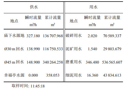 1 储水池分布情况选矿厂储水池共有4个供水点和4个出水点,它们的具体情况如下。4个供水点分别是:Ø45 m浓密机回水(DN350,v=0.3~2.16 m/s); Ø30 m浓密机(DN350,v=0.3~1.3 m/s); 庙下水源地(明渠, v=0.3~ 3.0 m/s); 幸福亭水源(DN600,v=0.5~1.06 m/s)。4个出水点分别是:破碎用水(DN200,v=0.3~2.46 m/s),其中一路用多级泵扬送至200 t高位水池, 再分为两路用水:破碎机用水(DN200,v=0.15~2.10 m/s)与冲矿池等用水(DN150,v=0.15 ~2.5 m/s));泥矿用水(DN125,v=0.3 ~1.13 m/s);磨重用水(DN600,v= 0.15~0.68 m/s);细泥用水(DN200,v=0.15~0.35 m/s)。