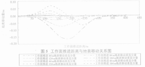 5 地表移动数值模拟结果分析通过对非临界开采状态下钼矿开采FLAC数值模拟, 数值计算得到地表移动图。为了研究地表移动与工作面推进的关系,做出地表移动变化曲线图,如图 5所示。从图中可以清楚地得到地表的水平移动分量随着回采区段尺寸的增大,水平移动值由工作面推进44 m时最大值3 mm逐步增大到工作面推进到164 m时的70 mm。采空区的正上方地表水平移动为零, 地表向采空区中央方向移动, 移动值以采空区中心点为中心对称分布。地表水平移动范围随回采区段尺寸的增大而增大。从图 5还可以发现地表的垂直移动分量随回采区段尺寸的增大而增大,由工作面推进44 m时最大值13 mm逐步增大到工作面推进到164 m时的160 mm。