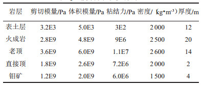 3 模型的建立模型以某钼矿为原型,简化后得水平长400 m,垂直60 m,其中钼矿层厚4 m,埋藏深度为48 m,钼矿层上覆4层岩层,岩层走向均为水平。采空区围岩受力视为平面应变问题,即所建模型属平面应变类型。岩层的力学参数和尺寸如表 1所示。整个模型划分为1 500网格(100×15)。切割槽距离模型左端为96 m。