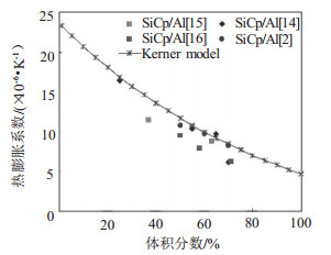 高体积分数SiCp/Al复合材料热膨胀系数远远低于铝合金,且可视碳化硅颗粒和基体合金的情况进行调控[13]。Carl Zweben等[2,14-16]所研究结果总结如图 1。随着SiC颗粒含量的增加复合材料的热膨胀系数明显降低,且大致与Kerner模型相符,这些结论可用来指导此类材料的热膨胀匹配设计;Y. Ma等[17]的研究结果,颗粒粒度对复合材料热膨胀行为无明显影响。而S.Elomari等[18]研究证明在SiC经氧化处理后,颗粒粒度越小,复合材料界面积越大,界面处晶格畸变的影响越大,复合材料的热膨胀系数减小,且在3 μm和40 μm的SiC颗粒表面同时形成约0.75 μm厚的氧化层时,二者的热膨胀系数相差1.28×10-6·K-1。