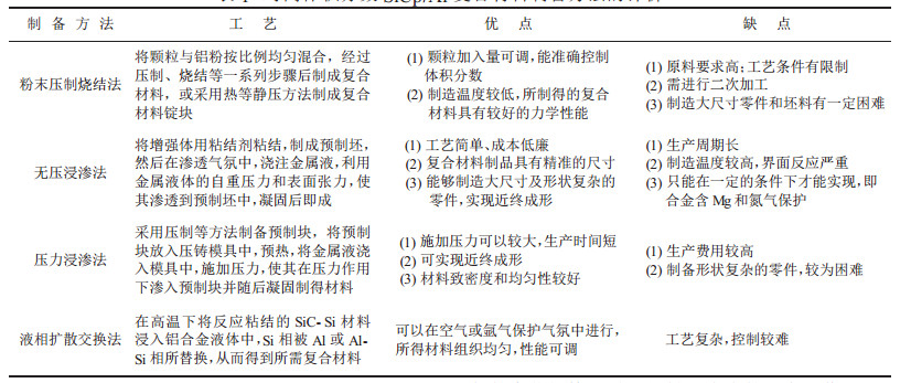 1 制备方法国内外学者对高体积分数SiCp/Al复合材料的制备方法做了许多的研究工作。其各种方法自身的工艺、特点及优缺点见表 1。