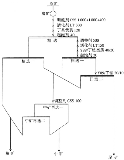 图 5 综合条件开路浮选流程及药剂制度 |