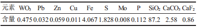 1 矿石性质入选矿石为石英脉类型,有用矿物以白钨矿为主,另含有少量的方铅矿、黄铜矿、闪锌矿、黄铁矿、磁黄铁矿。脉石矿物以石英、方解石为主,其次为斜长石、萤石、绿帘石、阳起石、透闪石等。其原矿多元素分析结果如表 1所示。