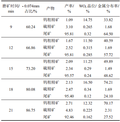 为了考察在不同磨矿细度中WO3的回收情况,在其他条件相同的基础上对该矿样进行了磨矿细度试验。试验条件与试验结果见表 2。