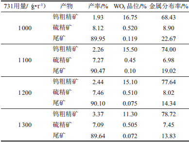 从表 4结果可知:随着氧化石蜡皂用量的增加,回收率逐渐升高,但精矿品位有所下降。综合考虑,选取粗选731氧化石蜡皂以1 100~1 200 g/t为宜。