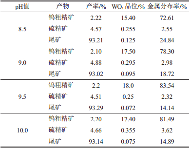(2) 白钨粗选pH值应控制在9.5~10.0范围内。
