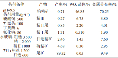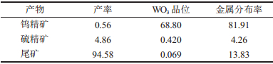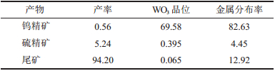 从表 6可知:白钨粗选产品经三次精选,所获精矿品位达46.85 %,回收率为70.25 %。