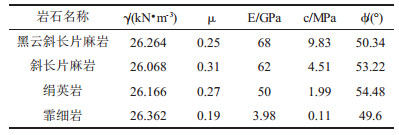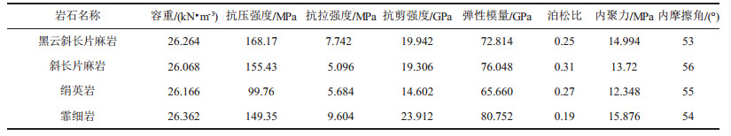 1 岩块的物理力学性质遂昌金矿矿区岩性主要有黑云斜长片麻岩、斜长片麻岩、绢英岩、霏细岩,其中黑云斜长片麻岩占矿区岩石的60 %。矿区地势陡峻,地形切割强烈,岩体裂隙发育,并且深度大、延伸长,使岩石受到不同程度的风化,一般来说,岩性不同、风化程度也不同,裂隙发育密集地段,风化作用较强烈。矿区岩石风化带按风化程度分为强风化和弱风化两个带,其中矿区强风化带不甚发育,弱风化带普遍较发育,弱风化岩石为斜长片麻岩、绢英岩、霏细岩等。矿区岩体结构以镶嵌结构为主,局部为碎裂结构,RQD为34 %~76 %,岩石质量劣-中等,工程地质条件较差-中等。矿区主要岩石的物理力学性质见表 1。