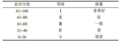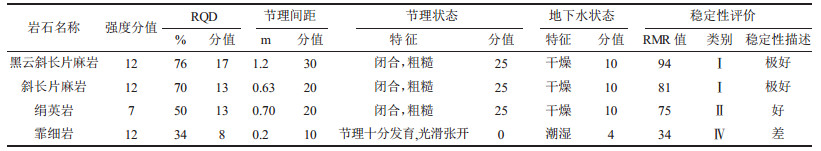 根据采空区围岩工程地质、水文地质条件以及矿体赋存条件、节理裂隙发育规律调查、矿岩力学性质实验结果等,采用CSIR分类指标值RMR(Rock Mass Rating)分类,该值由岩块强度、RQD值、节理间距、节理条件及地下水5种指标组成[2]。按总评分值进行岩体质量评价,见表 2、表 3。