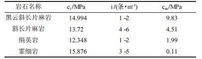 式中:cm为弱化后的岩体内聚力,MPa;ci为岩块的内聚力,MPa;i为表征节理裂隙密度的参数。