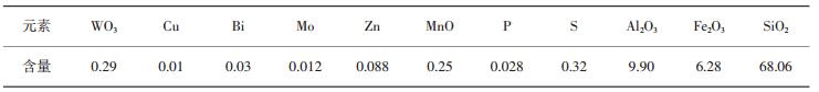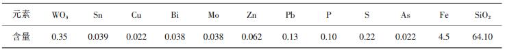1 原矿性质大吉山钨矿为高温热液充填的石英脉矿床,矿石中主要金属矿物为黑钨矿、白钨矿,其次为辉钼矿、辉铋矿、黄铁矿、磁黄铁矿及少量的孔雀石等;脉石矿物主要为石英、云母、方解石和少量电气石、石榴子石、绿柱石及金红石等;围岩为变质岩。黑钨矿为不均匀嵌布,在石英脉中,大粒结晶体达10 mm以上,细粒却只有0.04~0.01 mm;黑钨矿色褐黑,呈厚板状,矿石中白钨矿一般不多,色褐白,具油脂光泽,粒度一般比黑钨矿细。