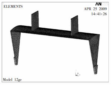 (3) 侧面连接单元约束简化。侧面是剖开后的对称结构,根据实际情况约束条件应为:限制垂直于侧对称剖面的法向位移自由度,以及除了这个方向以外的其余两个方向上的转角自由度。在ANSYS中使用它的对称面边界条件,即自动给它此种约束条件。