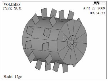 在ANSYS中应用复制面命令后实现将几个对称模型融合为整体,图 4为12个模型复制后形成的转筒模型图,可以方便的进行整体分析。