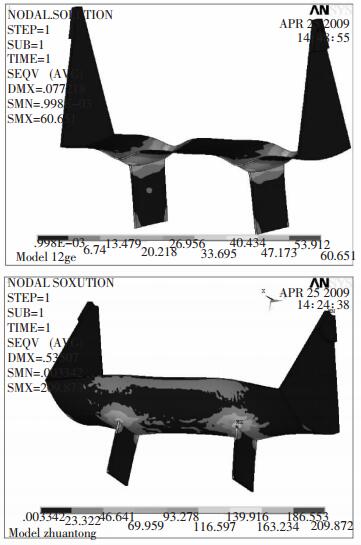 图 6为有限元模型的应力分布图,可以看出站筋与筒体焊接处为应力最大处,且拉应力数值为:12根站筋时60.051MPa,6根时209.872MPa。均没有超过314MPa,所以工况1下的强度可靠。