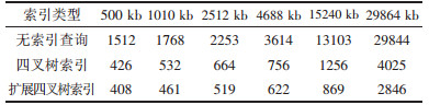 从效率分析数据可以看出,空间索引在减少数据冗余方面的作用是很明显的,无索引和带索引的查询时间相差很大.四叉树索引和扩展四叉树索引两者比较可以看出,扩展四叉树索引在减少数据冗余方面的作用效果明显,使查询效率提高了10 %~ 20 %,并且随着数据量的逐步增大,空间数据类型的复杂度的提高,扩展四叉树索引的作用更趋于明显,从实验数据可以得出,扩展四叉树索引机制的设想是可行的.