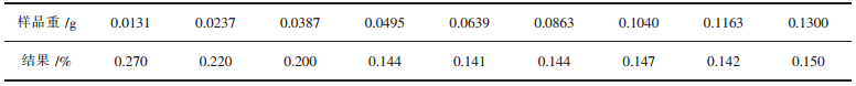 2.2 助熔剂用量试验以1 g镍箔为助熔剂,探讨镍箔与样品量的合适比例,结果见表 2.