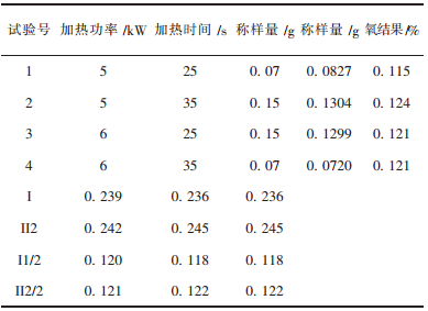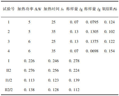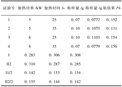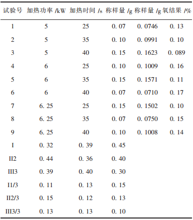 2.3 最佳提取条件选择加热功率是影响试样中熔融氧完全释放的关键因素[5-7].加热功率较低时,试样中的氧释放不完全,加热功率越高时,样品中的氧越易释放.但加热功率太高,坩埚的石墨挥发严重,容易造成结果偏低.选一氟化镝样品进行试验,对加热功率,加热时间,称样量按三因素三水平L9(33)正交表安排[8],试验结果及其分析列于表 3.