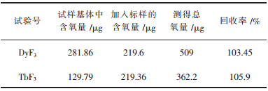 (1) 取日本标准样品SS-1-30(氧含量为440.3×10-6) 0.4987 g和经过多次测定有分析结果的DyF3样品0.0946 g,用镍箔包裹,按分析步骤测其氧质量分数为0.085809%,计算标准回收率.