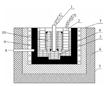 | 1.钨质阴极;2.石墨阳极;3.钼坩埚;4.保温材料;5.电解槽外壳;6.石墨坩埚;7.导电板;8.热电偶温度计;9.硅碳棒;10.熔体 图 1 试验装置示意图 |