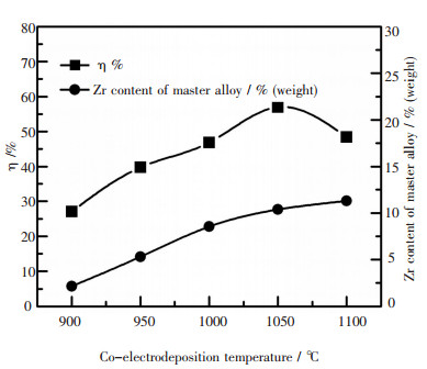 | 图 2 电解温度对电解电流效率及所得Gd-Mg-Zr中间合金Zr含量的影响 |