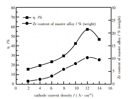 | 图 3 阴极电流密度对电解电流效率及所得Gd-MgZr合金中Zr含量的影响 |