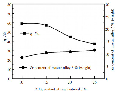 | 图 4 混合氧化物中ZrO2含量与电流效率及所得Gd-Mg-Zr中间合金Zr含量的关系 |