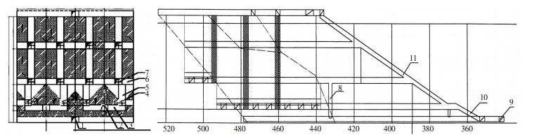 | 1.穿脉;2.出矿平巷;3.装矿斜巷;4.堑沟拉底巷道;5.切割天井;6.切割平巷;7.分段凿岩巷道;8.溜矿井;9.阶段运输巷道;10.斜坡道;11.上山 图 1 分段空场、单元回采嗣后高水胶结充填法 |