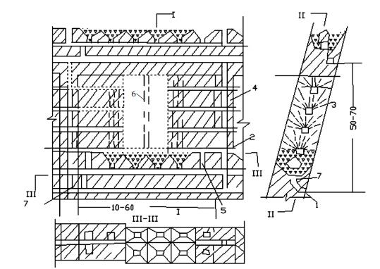 | 1.阶段运输巷道;2.拉底巷道;3.分段凿岩巷道;4.人行天井;5.斗颈;6.切井;7.溜井 图 2 分段充填采矿法 |