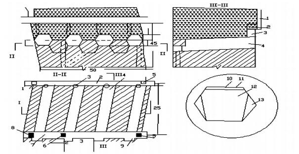 | 1.充填天井;2.充填平巷;3.充填小井;4.进路;5.人行天井;6.溜井;7.分层平巷;8.电耙绞车;9.绞车硐室;10.废钢绳;11.碎矿石层;12.第一次崩矿炮孔;13.第二次扩帮炮孔 图 3 下向六角形倾斜进路胶结充填法 |
