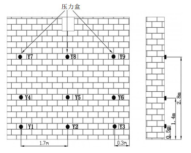 1 挡墙侧压力试验 1.1 试验过程试验地点为武山铜矿北矿带-260 m中段E8盘区第1分层,挡墙宽高尺寸为4 m×3.8 m.为了得到充填挡墙不同部位侧压力值,采用9个土压力盒布置在挡墙内侧,其中Y1、Y2、Y3 3个压力盒位于同一水平高度,距离底板0.5 m;Y4、Y5、Y6 3个压力盒呈同一水平高度,距离底板1.4 m;Y7、Y8、Y9 3个压力盒位于同一水平高度,距离底板2.8 m.同一水平高度的3个压力盒位置关系是:一个在挡墙垂直中线位置,其余两个分两边放置,距离挡墙垂直中线1.7 m处(见图 1).压力盒安装时先用胶带将压力盒固定在空心砖表面,墙体砌筑到指定位置时使用安装有压力盒的空心砖砌筑,确保压力盒受力面朝外(如图 2所示).