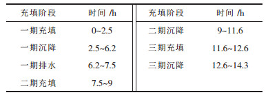 充填分为3个主要阶段进行:首先采用灰砂比为1:4的料浆充填下部,充填高度1.7 m;经过沉降排水后采用灰砂比为1:8的料浆充填上部,充填高度1.8 m;经沉降后采用不含水泥的尾砂料浆充填剩余空间将水挤出并使充填体接顶.充填过程中每10 min监测一次仪器,并在充填结束后继续监测2 h[5].