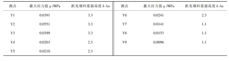 2 挡墙厚度设计根据试验结果选取充填中各测点的最大应力值以及各测点距离充填料浆面的高度h见表 2.