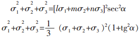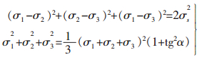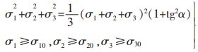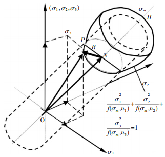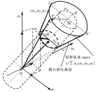 式(11)中σ10,σ20,σ30为初始屈服应力矢量端点的坐标,α为弹性硬化锥角.式(10)、式(11)为主应力空间以坐标σ1,σ2,σ3为变量的弹性二次锥面方程的不同形式.圆锥轴线σm等倾54°44′.
