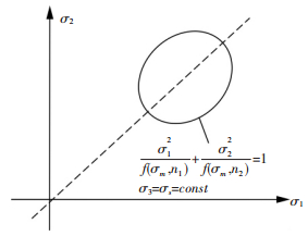 如果两向拉伸且强化系数都不等,即n1≠n2,σ3=0,则强化曲面轨迹变成二维椭圆[9],如图 5.此时强化方程满足: