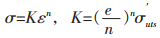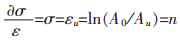 式(20)中K是强度系数即产生塑性真应变为1时的真应力值;n是硬化指数;注意到拉伸塑性失稳时[12-13]