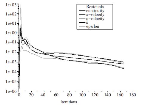 4 模拟结果及分析 4.1 残差动态显示图 2为此次数值模拟中各方程计算结果残差动态图.从图 2 中可以看出:此次数值模拟在迭代进行到大约170 步之后,迭代计算停止.其中,各个参数的残差随计算步数的增加而降低,最后趋于平缓,说明此次模拟在假设条件下取得满足要求的收敛.