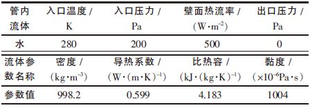 固体壁面处确定为无滑移条件,为了简化计算模型,假定换热过程,液体的物性参数为常值,管外的高温空气以恒定的壁面热流率形式施加[3-5],具体的载荷及流体物性参数如表 2 所示.