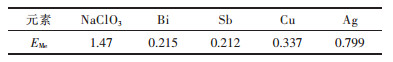 由表 3标准电极电位表可以看出,NaClO3的标准电极电位为1.47 V, 均高于铋、锑、铜、银的标准电极电位,使用NaClO3为氧化剂完全可以氧化铋、锑、铜,使得其在盐酸溶液中溶解.