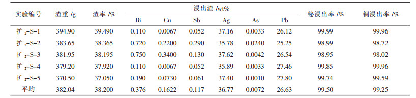 表 5、表 6分别为第2段盐酸浸出液和浸出渣的扩大试验数据,银有极少数(约0.06%)进入浸出液中,约2.77 %左右的铅进入浸出液,其余铅、银都富集于浸出渣中,渣含Pb 26.63 %左右、含Ag 36.77 %左右,铅、银得到很好的富集,铅和银的直收率分别为97.82 %、98.93 %,与传统火法处理银的直收率(85 %~88 %)相比[18],银的直收率有大幅度的提高,铋和锑的浸出率都在99 %以上,扩大实验数据证实了两段浸出工艺完全可行.