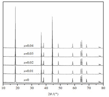 2 结果与讨论 2.1 掺镁对正极材料结构的影响图 1为正极材料Li (Ni1/3Co1/3Mn1/3)1-xMgxO2(x=0, 0.01, 0.02, 0.03, 0.04)的XRD谱图, 表 1为其晶胞参数和结构参数.